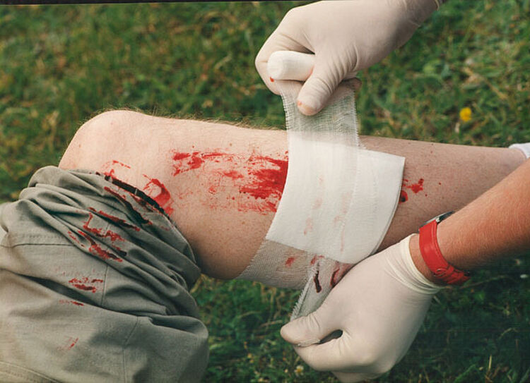 • Wundauflage (oder Kompresse des Verbandpäckchens) auf die Wunde legen und mit einem Verband zwei bis dreimal umwickeln.