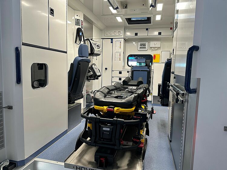 Die Innenausstattung des WAS 500 Rettungswagens ist darauf ausgelegt, den Mitarbeitern im Rettungsdienst ein ergonomisches und effizientes Arbeitsumfeld zu bieten. Komfortable Sitze, ein gut organisiertes Arbeitsplatzlayout und leicht zugängliche Steuerungen tragen zur Effizienz und Sicherheit des Teams bei. Ein integriertes Navigationssystem und ein leistungsstarkes Fahrzeugmanagement-System unterstützen den Rettungsdienst bei der effizienten Routenplanung und Fahrzeugüberwachung.