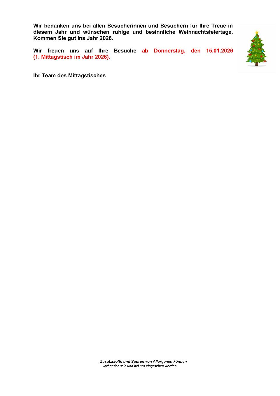 Unsere Mittagstische finden in der Luisenhüttenstraße 25 jeden Dienstag, Donnerstag und Freitag um 12.00 Uhr statt.